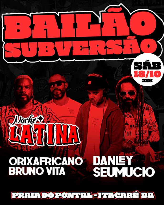 Bailão Subversão na Praia do Pontal convida uma das festas mais brabas de Ilhéus, Noche Latina com os DJs Orixafricano + Bruno Vita discotencando com o que há de melhor da música Sul Americana, com o BPM lá em cima para fazer a pista ferver e pegar fogo nesta noite repleta de suingue. Para abrilhantar mais o rolê, tem participações dos DJs Seumucio X Danley trazendo muita Afro Brasilidade.
