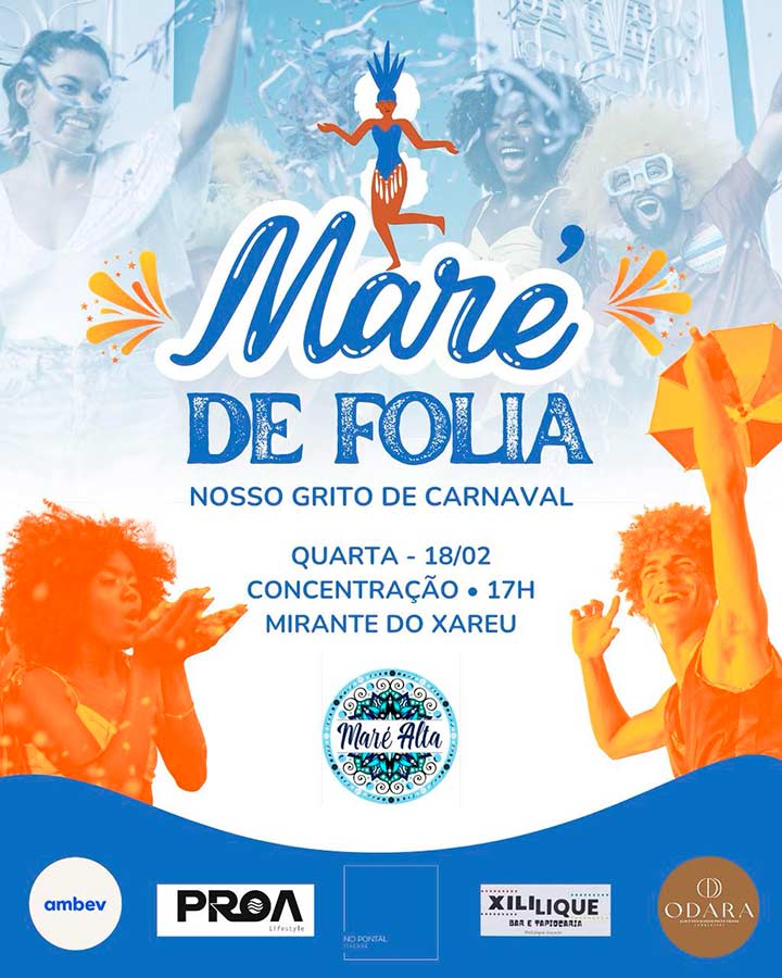 O bloco Maré de Folia sairá quarta de cinzas, 18/02, às 17h com concentração no Mirante do Xaréu! O bloco é a fantasia, ouse na produção e criatividade! O tema será o mar e seus tons de azul! Então tá liberado vir de bóia, prancha, biquíni, maio, água viva, peixe, sereia e tudo que for relacionado à esse universo encantado. Segue até o Forte num grande cortejo e em seguida até a Praia do Pontal.